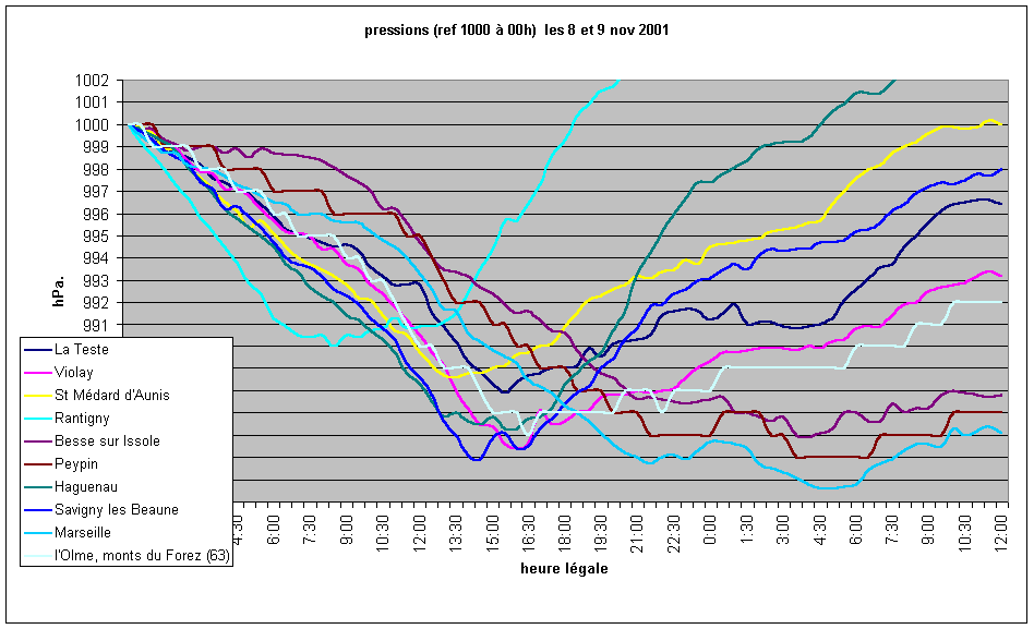 Le front froid (c'était de l'air arctique il me semble) qui a traversé la France du Nord au Sud les 8 et 9 novembre 2001 est représenté ici par sa signature en pression. Les pressions ont été arbitrairement fixées à 1000 hPa à 00h légales le 8 novembre ; la variation a bien entendu été respectée ensuite.