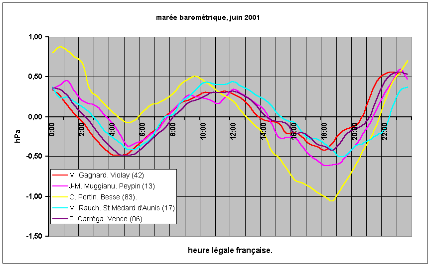 Voici des résultats de marée barométrique en juin 2001 pour quelques stations