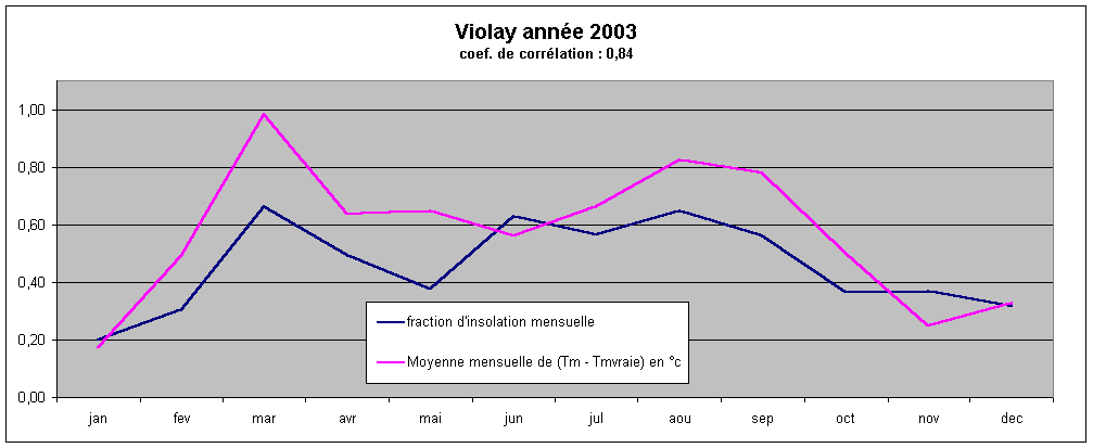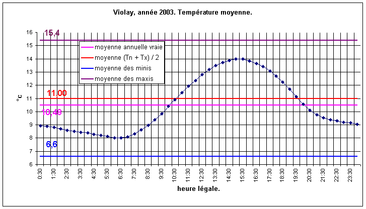 La température moyenne obtenue à l'aide des 17 518 valeurs de température de l'année 2003. Ces valeurs sont corrigées quotidiennement avec les mini et maxi lues sur les thermomètres Météo France. Si on ne doit faire qu'une mesure par jour, il faut la faire à 19h 30 ou 10h 30 pour obtenir une bonne moyenne annuelle.