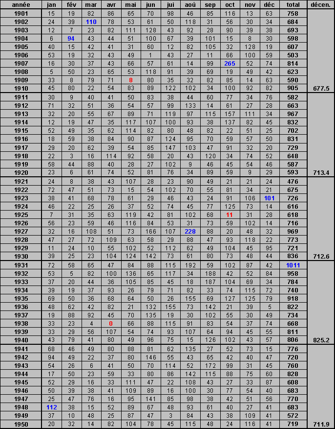 Les valeurs en bleu sont les records (période 1851-1999) de la colonne (i.e du mois) sélectionnée.
