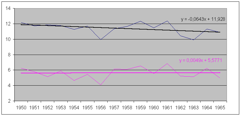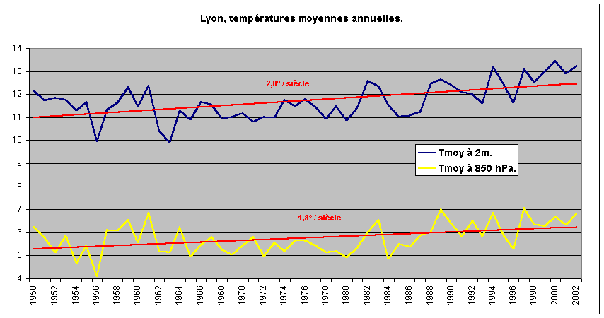 Voici l'évolution des températures moyennes mensuelles, au sol et à 850 hPa. Pour avoir la vitesse moyenne de réchauffement (ou refroidissement), vous prenez le coefficient de x et vous le multipliez par 100. exemple pour les janviers, réchauffement de 3.98° / s au sol, 3.97° à 850 hPa.