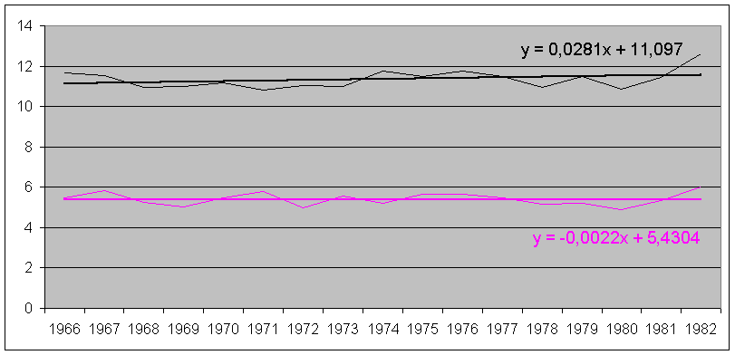 Entre 1966 et 1982, l'inverse qui se produit : toujours la stabilité en altitude et début de réchauffement au sol :