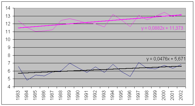 Enfin de 1983 à 2002, le réchauffement s'emballe en surface (vitesse de près de 9° / siècle) mais reste modéré à 1500 m :