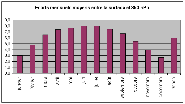 Si l'accroissement de température est similaire entre le sol et 850 hPa pour les mois froids (faiblement ensoleillés), il devient nettement différent pour les mois chauds. Une des raisons possibles est la convection, toujours faible en hiver et d'autant plus importante que le sol est chaud. La convection d'un air non saturé diminue la température de cet air de 1° par 100 m d'élévation.