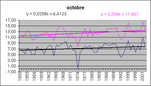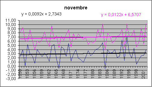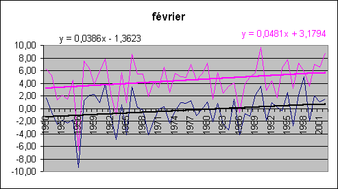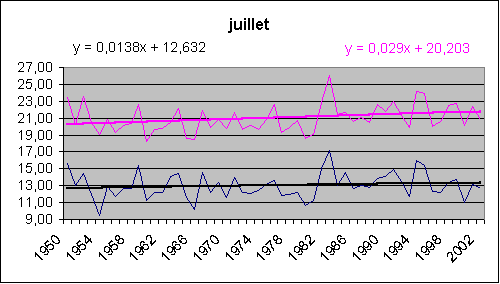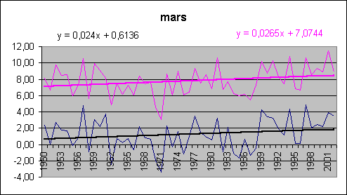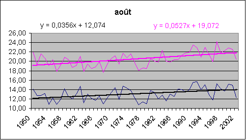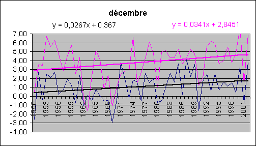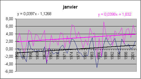 Les mois de décembre, janvier, février accusent une hausse spectaculaire tant au sol qu'en altitude. Août est le champion du réchauffement (et encore, août 2003 n'est pas comptabilisé !) avec 5.3° / siècle au sol.