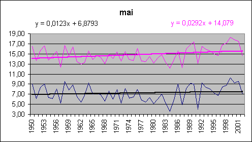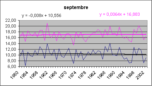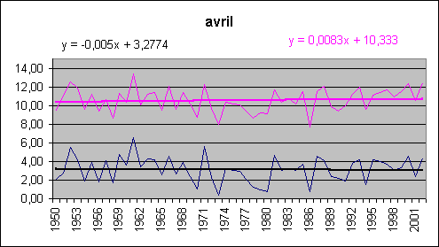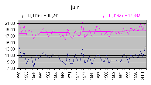 Admirez la sublime symétrie entre mars et décembre ; janvier et février restant très à part. moyenne maxi date mini date janvier -0,1 3,1 1989 -5,0 1985 février -0,3 5,0 1998 -9,3 1956 mars 1,3 4,9 1997 -3,4 1971 avril 3,1 6,5 1961 0,3 1973 mai 7,2 10,2 1999 3,6 1984 juin 10,3 13,9 2002 7,5 1956 juillet 13,0 17,1 1983 9,5 1954 août 13,0 15,6 1992 10,7 1977 septembre 10,3 14,1 1987 6,2 1952 octobre 7,1 10,8 2001 0,0 1974 novembre 3,0 7,1 1994 -0,6 1985 décembre 1,1 4,2 1987 -2,9 1969 année 5,8 7,1 1997 4,1 1956