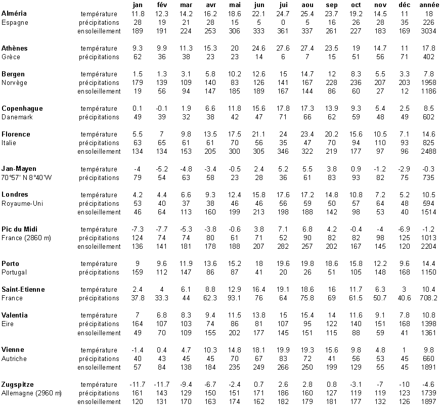 Température en ° c, précipitations en mm, insolation en heures.