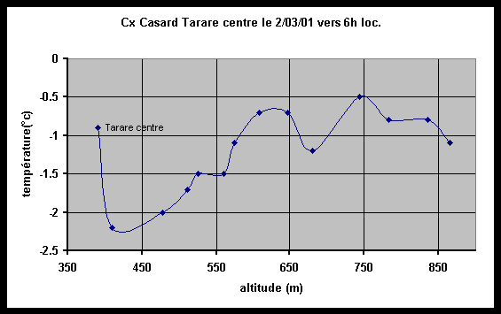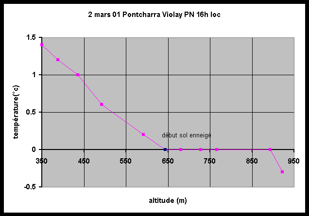 L'après midi : l'air doux arrive et commence à faire fondre la neige : remarquez la superbe constance du thermomètre durant le trajet enneigé et à l'abri du vent. La température n'a pas varié d'un dixième sur 5 km et 250 m de dénivelé ! preuve incontestable que l'eau change d'état à 0°c ; il est fort probable que cette température était bien moins uniforme à 10 ou 20 m du sol.