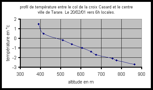 Nous avons un gradient moyen de 0.7° par 100 m (entre le sommet et l'altitude 415 m), ce qui constitue un gradient "normal" pour une fin de nuit avec un courant de Nord.