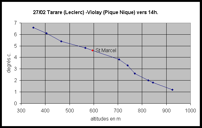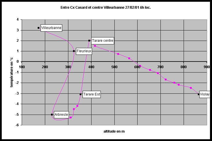 Tout commence par une classique augmentation de température jusqu'à Tarare centre (on retrouve le petit crochet du centre ville). Puis en l'espace de 1 à 1.5 km, la température chute de 5° environ : on entre dans la nappe froide vers l'altitude de 350 m. Le plus froid est d'environ -5.5° entre Pontcharra et l'Arbresle. A Fleurieux (100 m plus haut que l'Arbresle), on est de nouveau sorti de la mare froide.