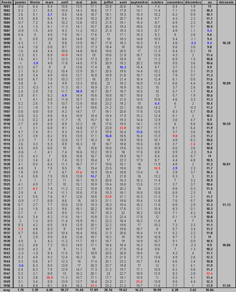 Moyennes mensuelles des températures moyennes vraies (calculées à l'aide des 24 observations horaires quotidiennes). En ° Celsius.