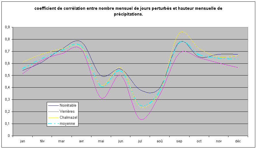 Il est associé à chaque mois (entre janvier 1974 et décembre 2000) le nombre de ses jours perturbés selon la classification de Guy Blanchet (voir détails ici) et sa hauteur de précipitations. Les coefficients de corrélation en question dans le graphe ci-dessous sont bâtis à l'aide de ces deux listes.