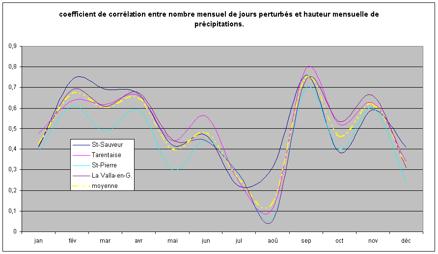Il est associé à chaque mois (entre janvier 1974 et décembre 2000) le nombre de ses jours perturbés selon la classification de Guy Blanchet (voir détails ici) et sa hauteur de précipitations. Les coefficients de corrélation en question dans le graphe ci-dessous sont bâtis à l'aide de ces deux listes.
