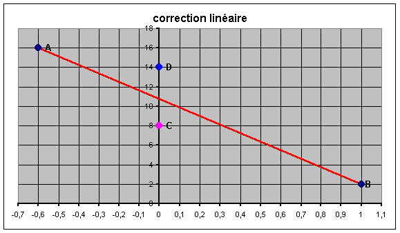 Si la température à corriger est de 14° (point D) alors la correction à apporter sera négative (de D il faut se déplacer vers la gauche pour rejoindre le segment rouge) et vaut approximativement -0.37°, on aura donc Tcorr = T - 0.37°.
